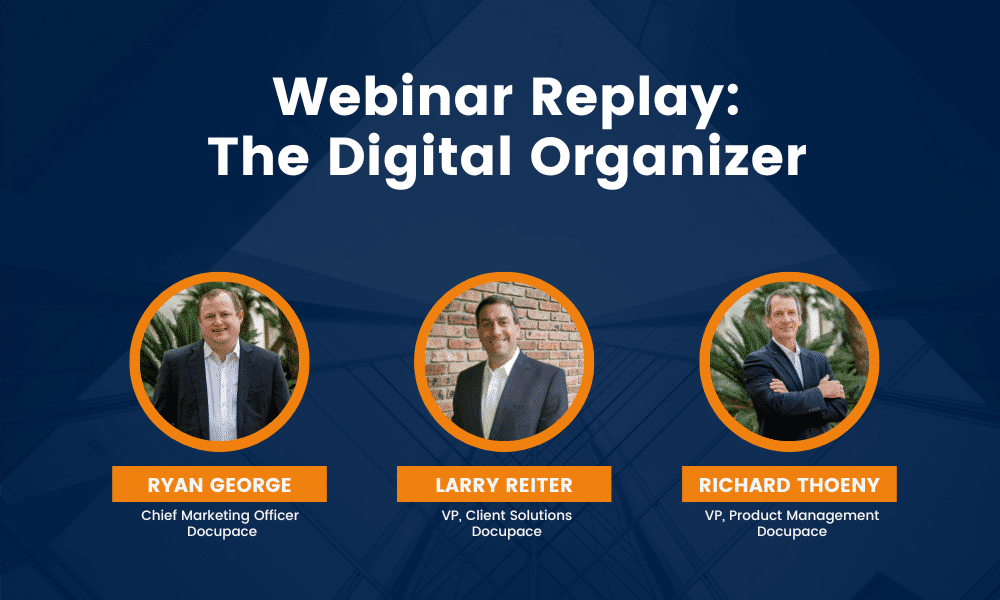 We invite you to listen in as host Ryan George and Docupace SMEs Richard Thoeny and Larry Reiter demonstrate the different features of this turnkey solution to end your filing cabinet headache.